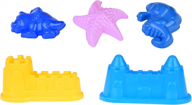 Fem forme (borge, søstjerne, dinosaur, søhest) samt sæt med skovle og river gør det muligt at skabe varierede byggerier og detaljer.