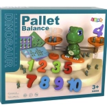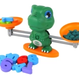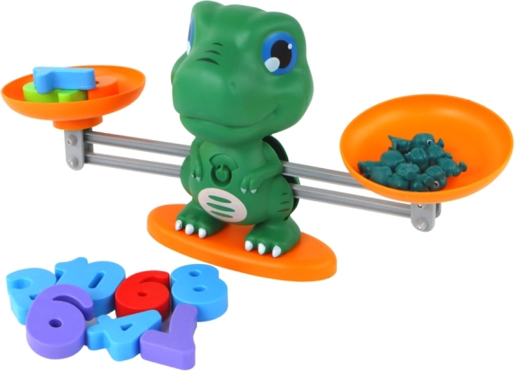 Dinosaur-vægten med to skåle hjælper børn med at forstå, hvordan tal og mængder afbalanceres. Ideel til første møde med begreberne større/mindre og lig med.