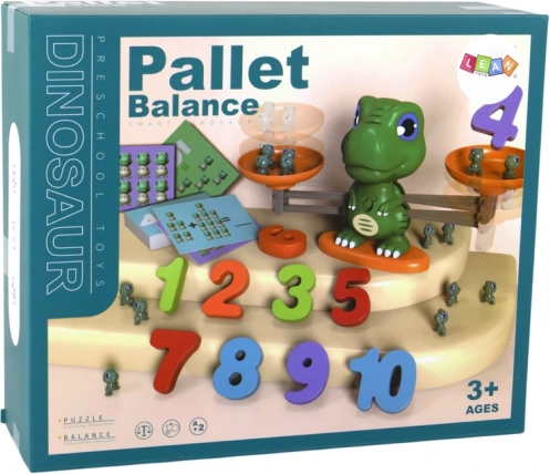 - Balancevægt formet som dinosaur, 2 skåle, 30 dobbeltsidede opgavekort, 19 dinosfigurer, 10 tal, vejledning