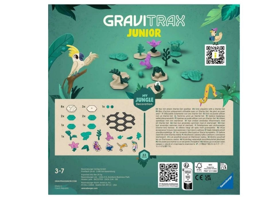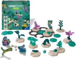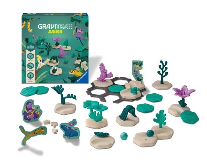 GraviTrax Junior er et interaktivt kuglebane-system til børn fra 3 år. De mindste bygger deres egne verdener af kuglebaner, som kan dekoreres efter ønske og skabe forskellige tematiske universer. Børn får dermed masser af sjov gennem kreativt byggeri. Jungle-udvidelsen indeholder forskellige dekorative elementer samt figurer af jungledyr og planter. Så kan børn udforske dette miljø inden for GraviTrax-banen og starte eventyret i junglen. Alle bygge- og dekorationselementer er fremstillet af træbaseret bioplast. Udvidelsen indeholder 33 bygge- og dekorationsdele.