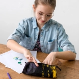 Med mål ideelle til standard skriveredskaber tilbyder det rigelig opbevaringsplads, mens dets kompakte design gør det let at transportere. Det stilfulde look fuldendes af et moderne sort-gult mønster med det markante "Baagl"-logo.