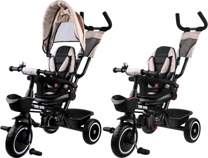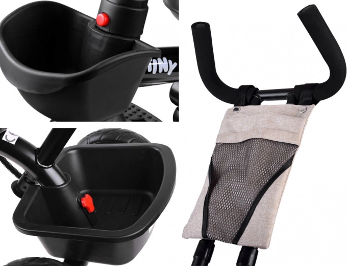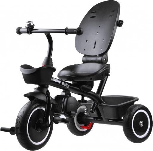 Forældre vil sætte pris på den justerbare styrestang med komfortgreb, de dobbelte parkeringsbremser på baghjulene og de praktiske opbevaringsmuligheder: foran kurv, stor bagkurv samt en lille taske til småting. Hjul af EVA-skum kræver ingen oppumpning og giver en stille og stabil kørsel. Klapbare fodstøtter og pedaler på forhjulet gør det nemt at skifte mellem tilstande, så trehjuleren problemfrit vokser med barnet.