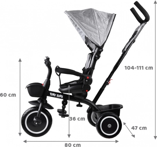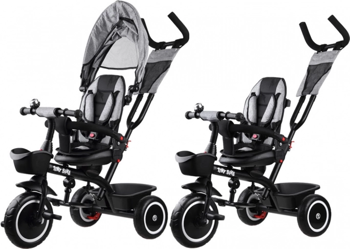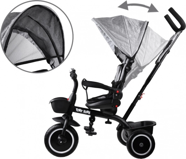 Denne multifunktionelle trehjuler TINY BIKE kombinerer fordelene ved barnevogn, løbecykel og klassisk trehjulet cykel. I starten styrer du den nemt med forældrehåndtaget, senere skifter barnet til selvstændig pedalering. Det drejbare sæde muliggør kørsel vendt mod forælder eller i kørselsretningen, og det polstrede betræk kan let tages af og vaskes.