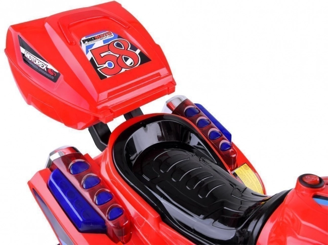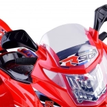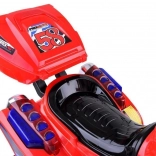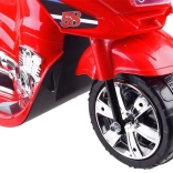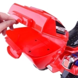Betjeningen er enkel: start med ON/OFF-knap og realistisk motorlyd, speeder på pedalen og automatisk elektrisk bremse når pedalen slippes. Børn vil elske de glade melodier, sidespejle, klart vindskjold og den nyttige bagboks til småting.