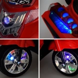 En stilfuld batteridrevet børnemotorcykel med farverig LED-belysning foran, på siderne og i hjulene giver en sikker og sjov køreoplevelse både inde og ude. Takket være elektrisk bremsning ved slip af speederen, nem påstigning og en praktisk bagboks er den ideel til små førere, der elsker fart og lyseffekter.