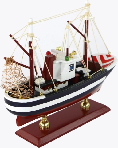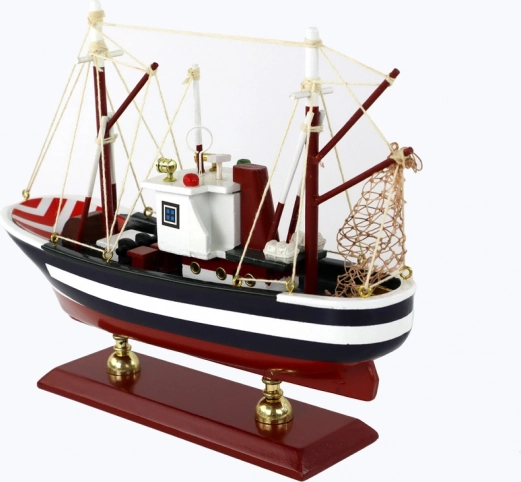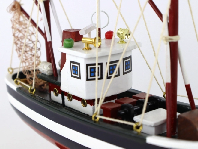 Denne træsamlermodel indfanger perfekt stemningen fra den maritime verden. Kombinationen af mørkeblå farve med hvide striber og den markante udsmykning på stævnen skaber et klassisk, autentisk look. Præcist fremstillede master med net og en omhyggeligt udført navigationskabine understreger håndværkskvaliteten.