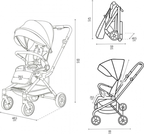 Barnevognen foldes med én hånd til kompakte mål og kan bekvemt bæres takket være det integrerede håndtag. Trestrins ryglænsjustering inklusive fuld liggestilling, justerbar fodstøtte og udvidelig kaleche giver maksimal komfort til barnet. Sikkerheden varetages af 5-punktssele, aftagelig bøjle og dobbelt lås mod utilsigtet sammenklapning.