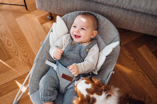 Den vibrerende liggestol er udstyret med trepunkts sikkerhedsseler og bløde fløjlsagtige 'vinger' for maksimal komfort til din baby.