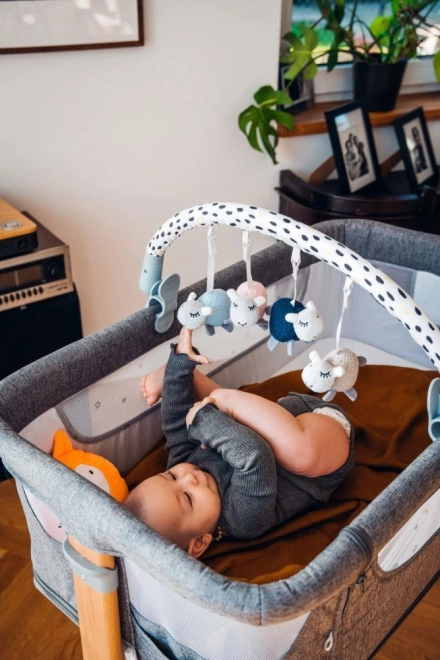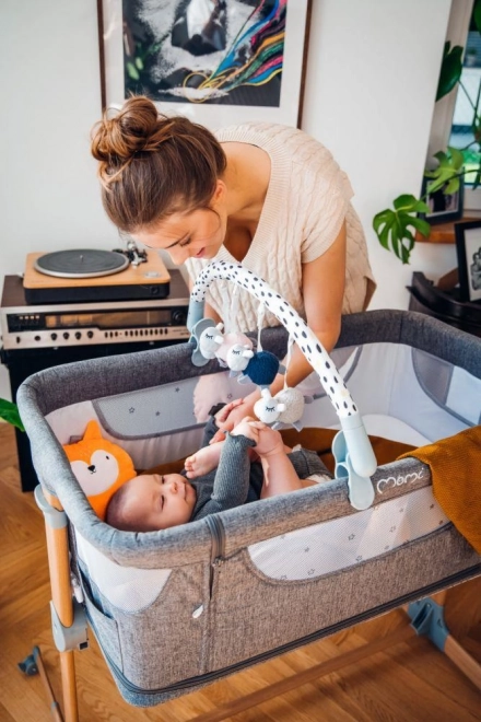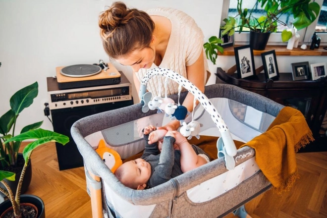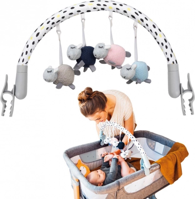 Legebøjlen med legetøj MoMi JOY er nyttig i mange situationer. Takket være dens universelle holder kan du bruge den:
