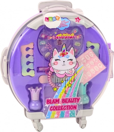 Dette bærbare skønhedssæt i en sød lilla kuffert vil glæde alle små stylister. Børn kan prøve at male negle, sætte klistermærker og lave let make-up, alt sammen pænt organiseret i den kompakte kuffert med hjul og håndtag. Et godt valg til udflugter, besøg og daglig leg.