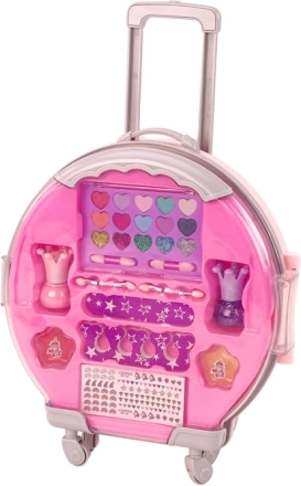 Denne rosa kosmetikpakke til børn leveres i en sød kuffert på hjul med udtrækkeligt håndtag, så små stylister kan tage den med overalt. Indeni venter et rigt indhold: palet med 15 nuancer øjenskygge (8 let glitrende, 2 matte, 5 kraftigt skinnende), 2 neglelakker (glitrende lilla og klassisk rosa), 2 lipgloss, negleklistermærker og praktiske redskaber.