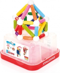Denne udvidede SMARTMAX-beholder indeholder 70 robuste magnetdele: 38 korte stave, 12 lange stave og 20 metal-kugler. Delene er store, holdbare og sikre for små børn – ideelle til de første magnetiske opdagelser og storslåede konstruktioner. Den gennemsigtige plastboks med solidt låg kan bruges på begge sider som byggebase.