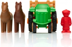 Sættet indeholder en traktor og to heste, som børn kan bygge efter deres egne idéer. Bonde figuren tilføjer til sjov, stimulerer fantasifuld leg og udvikling af sociale færdigheder i børn. Med klare farver og enkel design er dette byggesæt egnet til små hænder.