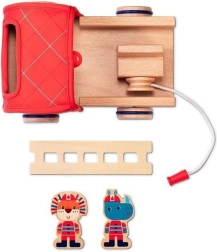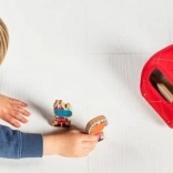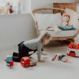 Den høje kvalitet kombinerer naturligt træ, slidstærkt tekstil og metal. Hjulenes gummikant er skånsom mod gulvet, og kørslen er lydsvag. Legen udvikler finmotorik (gribe, indsætte, dreje, rulle op), hånd–øje-koordination samt sanser – berøring, syn og hørelse.