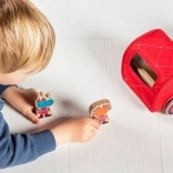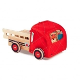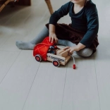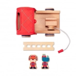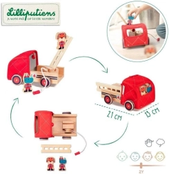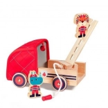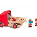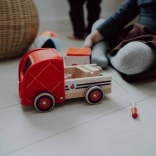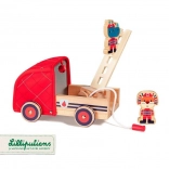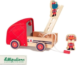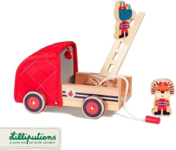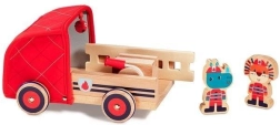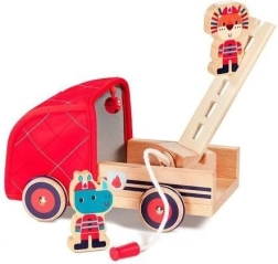 Dette gennemtænkte brandmands-sæt giver børn timevis af leg og læring. Bilen har et drejeligt udtræk på ladet, hvor den oprullelige snorslange fastgøres, i et særligt udskåret rum placeres den træstige, og i den bløde kabine gemmer der sig en klokke. To træfigurer – Næsehornet Marius og Løven Jack – indbyder til rolleleg, redningsmissioner og opdigtede historier.
