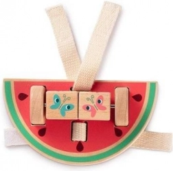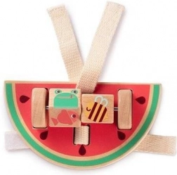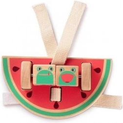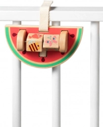 • Træ melonskive med metalstang og to roterende klodser med dyregrafik til styrkelse af fingerfærdigheden.
