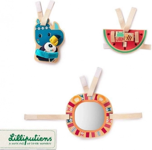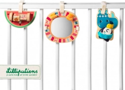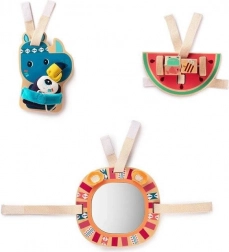 Hver af legetøjene er udstyret med praktisk velcro for nem montering på barnevogn, autostol eller barneseng. Disse legetøj hjælper blandt andet med at udvikle hånd-øje-koordination og sanseopfattelsen gennem berøring, syn og hørelse.
