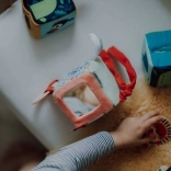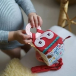 Terningen indeholder forskellige stimulerende elementer, herunder spejl, rangle og knitrepaneler, som understøtter børns sanseopfattelse.