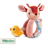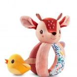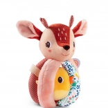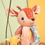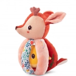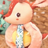 Rådyret Stella er en blød stofven, der underholder babyen med at gribe, ryste, putte ind og tage ud. Kroppen består af en blød kugle med fem greb – ét med hale, et andet med knitreeffekt og en tekstureret “regnbue” for rige taktile oplevelser. I hovedet er der en blid klokke, den gule fugl på bånd rasler behageligt og kan skubbes ind og ud.