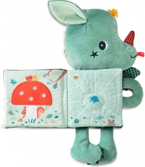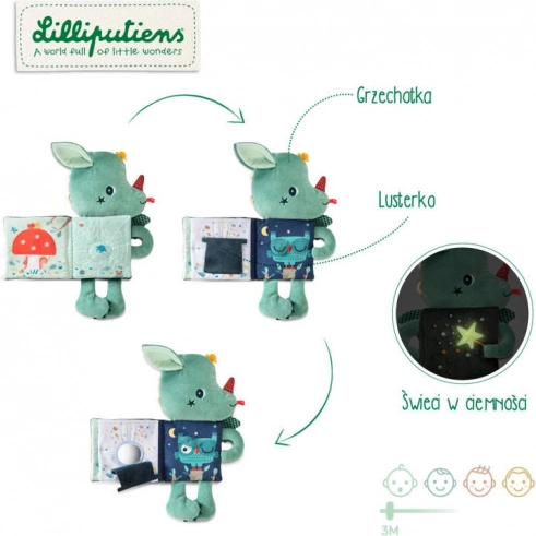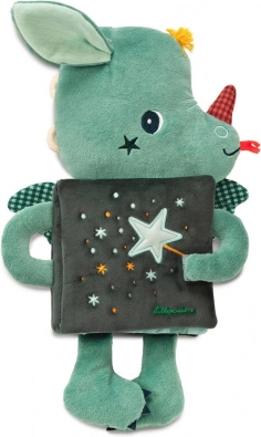 Denne multifunktionelle krammeven med bog fra Lilliputiens forener et blødt plysdyr og den første læseoplevelse i ét. Den lille drage Joe har markante detaljer – vinger, ører, en sød tunge og praktisk fastgørelse af bogen med velcro. Hver side overrasker med en ny effekt, der udvikler syn, hørelse og følesans.