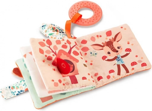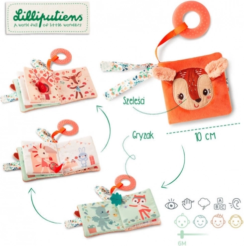 Den første bløde stofbog til babyer fra Stella-kollektionen fra Lilliputiens kombinerer et blødt plysomslag med det søde ansigt af et rådyr, knitrende sider, forskellige teksturer og en struktureret bidering, der lindrer ved tandfrembrud. Støtter sanseudvikling, finmotorik og fantasi, fastgøres nemt på barnevogn takket være strop med velcro og er ideel som gave til babyer fra 6 måneder.