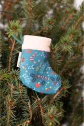Nissen er placeret i en blå strømpe, der lyser i mørket, hvilket giver produktet en magisk og legende stemning.