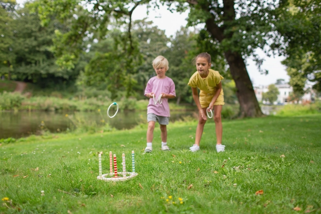 Dette traditionelle spil med en træbase og farvede ringe er ideelt til både udendørs og indendørs brug. Afprøv dine færdigheder i at kaste ringe på farvede pinde og saml så mange point som muligt. Spillet er både sjovt og udfordrende, da du kan justere kasteafstanden.