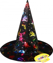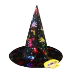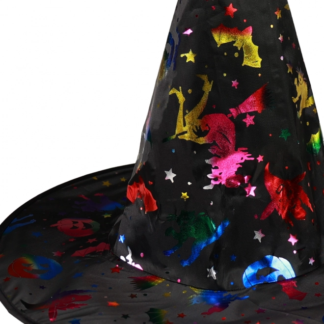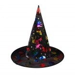Gør dig klar til Halloween eller temafester med denne heksehat. Hatten er sort med holografiske mønstre, der forestiller flagermus og stjerner – perfekt til enhver, der vil skille sig ud.