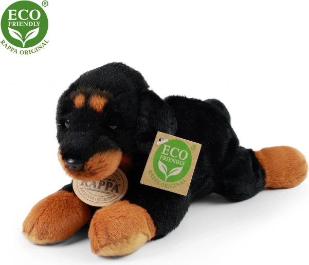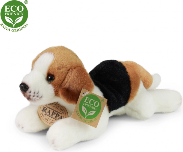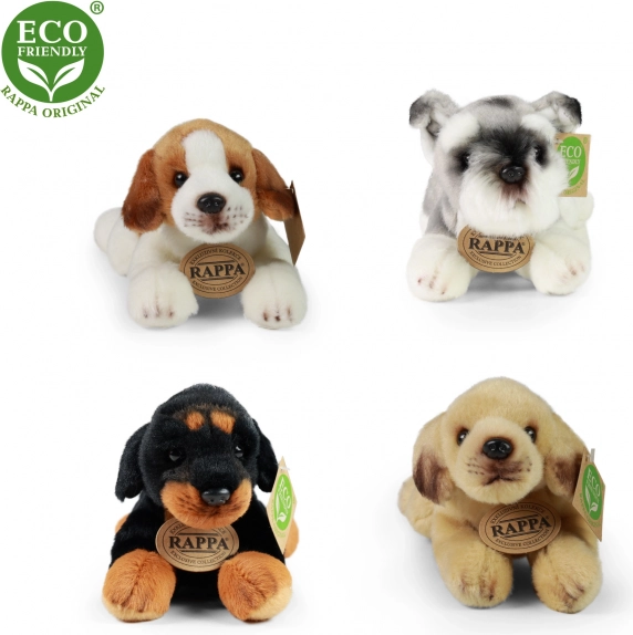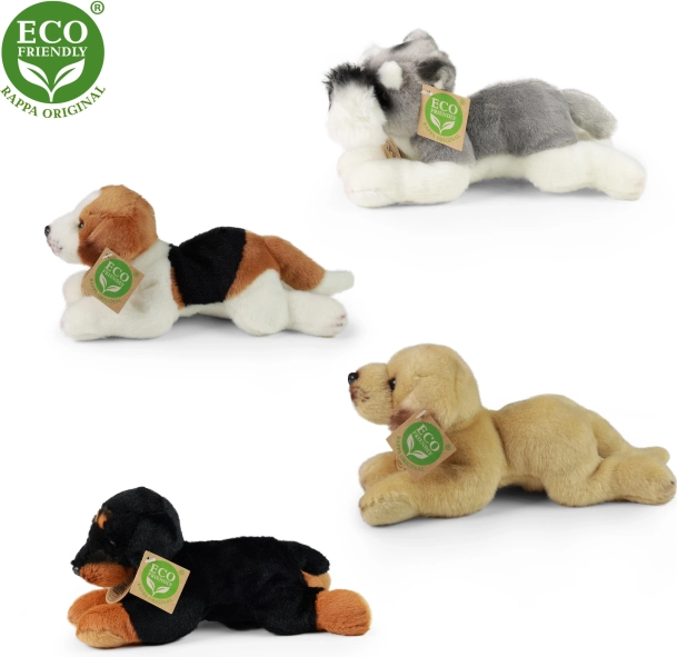 Plys hund liggende i størrelsen 16 cm, tilgængelig i forskellige racer som beagle, ruhåret, labrador eller rottweiler. Fremstillet af økologiske materialer, der opfylder alle sikkerhedsstandarder.