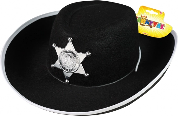 Giv det lille cowboykostume et autentisk udtryk. Denne børne-cowboyhat i elegant sort er prydet med en markant sherifstjerne og en hvid kontrastkant, som giver et stilfuldt præg. Hageremmen sørger for, at hatten sidder godt, også når der leges vildt.
