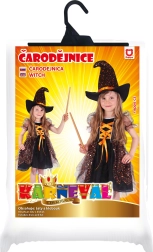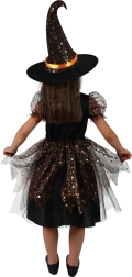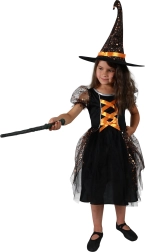 Det sorte kostume med orange bånd og metalliske stjerner giver et stilfuldt look til enhver lille heks.
