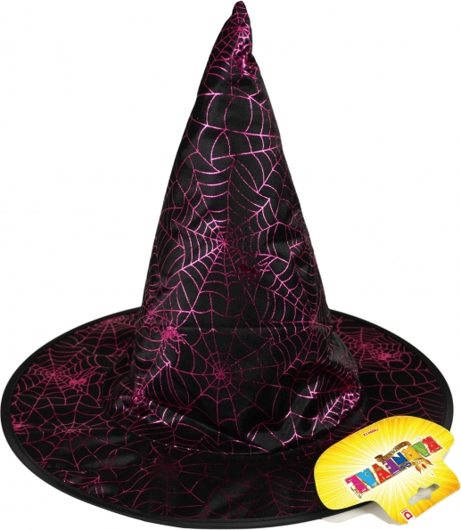 Den sjove heksehat er et perfekt tilbehør til fastelavn og Halloween! Den sorte hat er pyntet med lilla, glitrende spindelvæv.