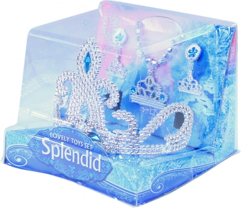 Forkæl din lille prinsesse med dette fortryllende sæt, der inkluderer en krone, øreringe, halskæde og ring med blå dekorative elementer.
