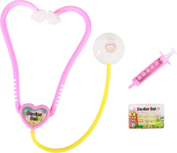 Børnekostumet inkluderer et pink stetoskop og en gul sprøjte, der ligner rigtige lægeværktøjer.