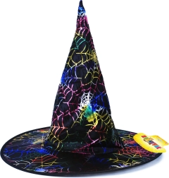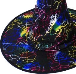 Giv dit Halloween- eller karnevalskostume et unikt præg med en elegant sort heksehat pyntet med farvede spindelvæv. Det lette og fleksible materiale er behageligt at bære, mens den brede skygge og kegleformede spids skaber den ikoniske silhuet.
