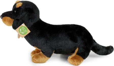 Denne plyds-gravhund i siddende position vil vinde hjertet hos både børn og voksne. Den bløde, behagelige plyds kombineret med troværdige farvedetaljer giver et realistisk udtryk og indbyder til kram og fantasifuld leg. Fyldet af genanvendte PET-flasker er fuldt certificeret og føles som standardfyld.
