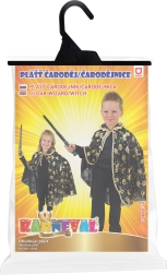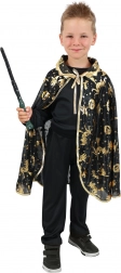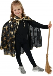 Sort børneheksekappe med gyldent print af stjerner, måner og andre motiver, som straks forvandler ethvert barn til en lille troldmand. Den er let, behagelig at have på og nem at tage på takket være bindelukningen ved halsen.