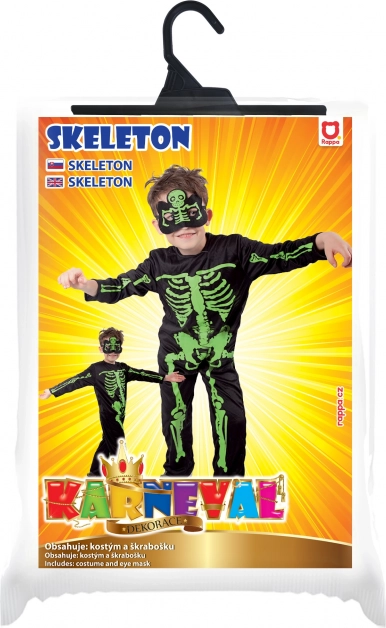 Stilfuldt børnekostume som skelet med markante neongrønne knogler på sort baggrund. Ideelt til Halloween, fastelavn og temafester. Sættet inkluderer heldragt og maske for et komplet uhyggeligt look. Behageligt materiale, nemt at tage på og effektivt neonprint giver masser af sjov og opmærksomhed.