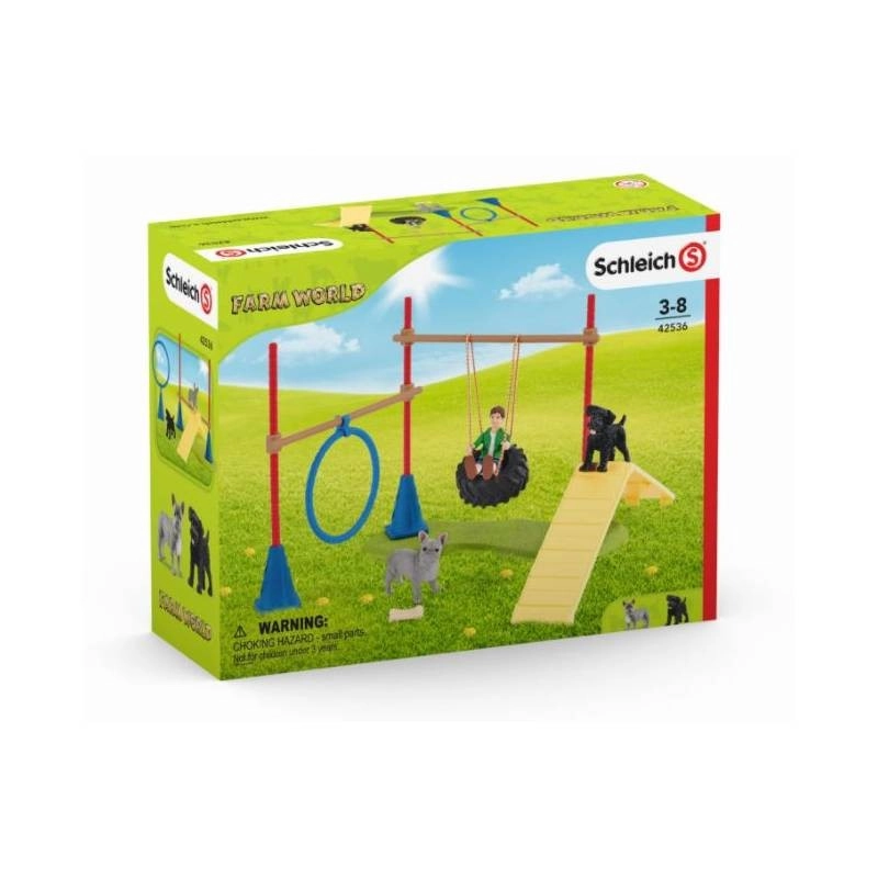 Hundelegepladsen fra Schleich-kollektionen Farm World byder på en sjov agilitybane med hopring, vippe-balancebom og kegler med stang. Takket være figurernes realistiske detaljer træder barnet let ind i gårdverdenen og skaber sine egne historier fulde af glæde og bevægelse.