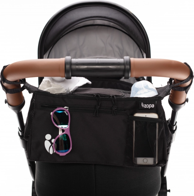 En praktisk og overskuelig organizer til barnevognen er ideel til gåture med baby. Forsiden af organiseren har en stor lynlåslomme til småting, som mor kan få brug for under turen. Forsiden er også udstyret med en lomme i net til mobiltelefonen, så man altid kan se, hvis der sker noget med telefonen, selv i lydløs tilstand. På den måde vækkes baby ikke af noget.