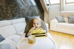Perfekt hjælp til hver fodring, silikone hagesmæk med bi motiv tilbyder et let og behageligt design. Med justerbar lukning om halsen er den ideel til hvert barn.
