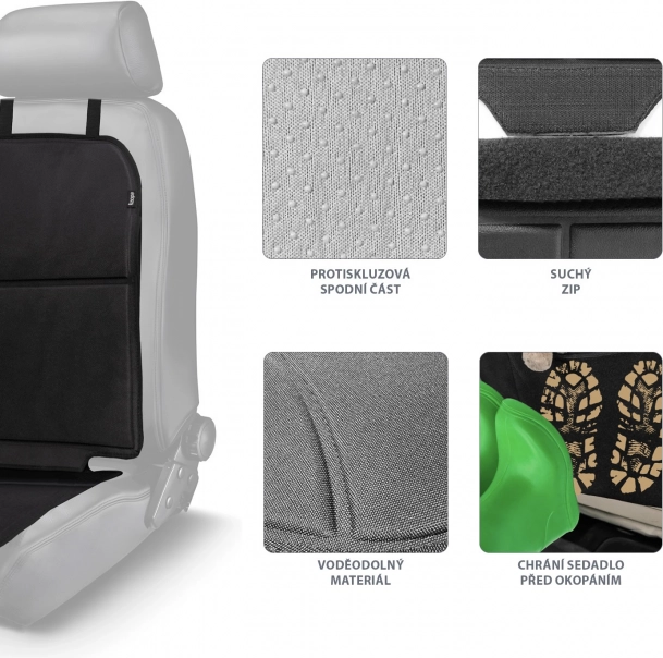 Sædebeskytteren under autostolen er det ideelle valg til at bevare bilens interiør rent og uden skader. Takket være den skridsikre overflade står autostolen sikkert fast, mens den formede underside effektivt forhindrer spredning af snavs og skader på sædet.