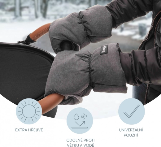 Handskerne er kompatible med de fleste barnevogne – fra modeller med samlet håndtag til klapvogne. Takket være det universelle design er de et ideelt valg til daglige vinterture.
