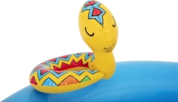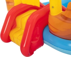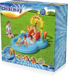 Legecentret kombinerer vandsjov med bevægelse og lege: børn kan suse ned ad den aftagelige rutsjebane, prøve ringspil på hestesko og ride på den oppustelige hest. Når legen er slut, tømmer du blot vandet, og poolen er let at pakke sammen. Pakket inklusive en reparationslap for længere levetid.