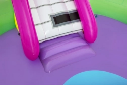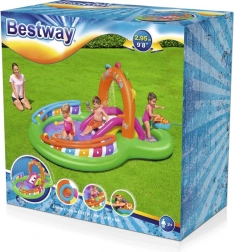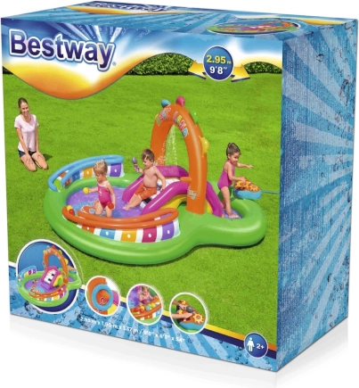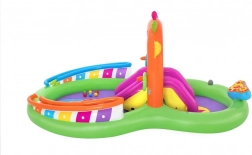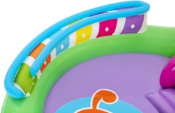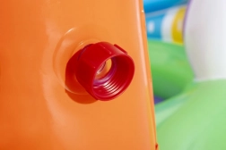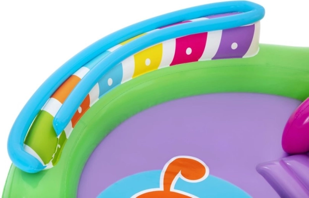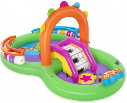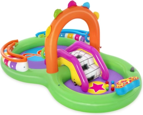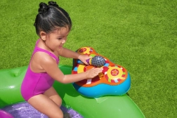 Udforsk og nyd mange sjove funktioner med det oppustelige vandlegecenter Sing and Splash. Legeområdet indeholder en mikrofon og en tromme, som børn kan lege med og bruge deres fantasi. De dobbelte bassiner er forbundet af en aftagelig rutsjebane, fastgjort med reb og stropper. I bunden er der indbygget en oppustelig pude for en blød landing fra rutsjebanen. Buen med indbygget sprinkler skal blot tilsluttes en havslange. Man kan kaste oppustelige ringe på piggene på buen. Sættet indeholder 6 farvede bolde, som du kan lade rulle ned ad både den ene og den anden rampe. Disse lege er ikke kun sjove, men udvikler også hånd-øje-koordination.