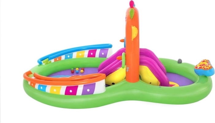 Indeholder: 1 lille bassin, 1 rutsjebane, 1 tromme, 2 oppustelige ringe, 1 mikrofon, 6 farvede bolde, 1 reparationslap.
