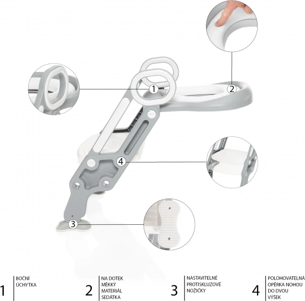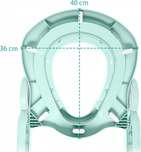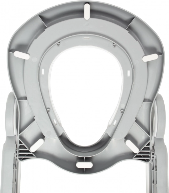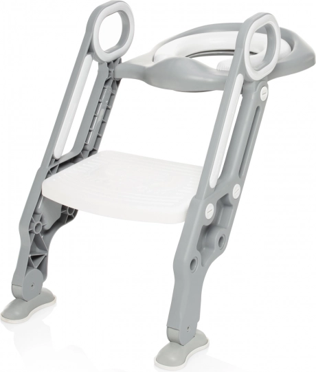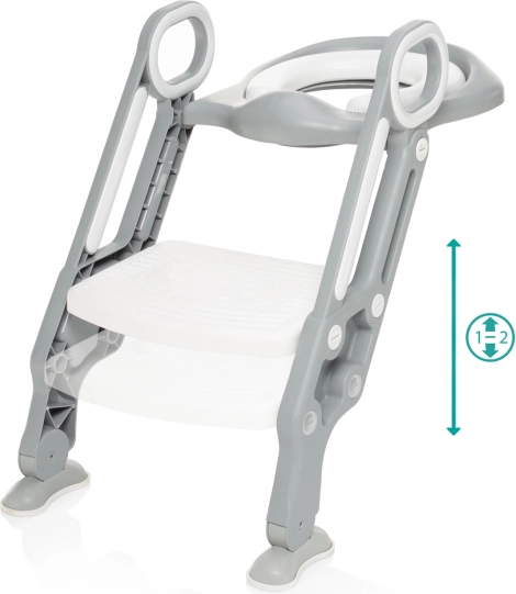 Takket være den højdejusterbare konstruktion “vokser” trinene med dit barn, indtil de ikke længere er nødvendige. Den solide konstruktion sikrer, at barnet føler sig trygt både når det klatrer og når det sidder. Benene er udstyret med et særligt skridsikkert lag, som giver stabilitet og støtte. Sættet inkluderer også et blødt og behageligt sæde, der fungerer som reduceringsring til standardtoiletter. Den anatomiske form sammen med en forhøjet bagkant forhindrer effektivt uønsket tilsmudsning.