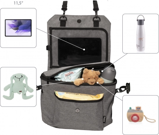 Indeholder en ekstra stor lomme med lynlås og en mindre forlomme. Der medfølger også en holder til 11,5" tablet, så børnene kan underholdes selv på længere ture.