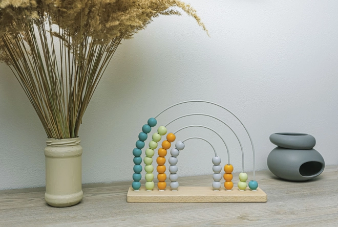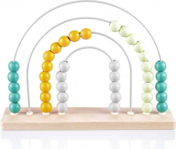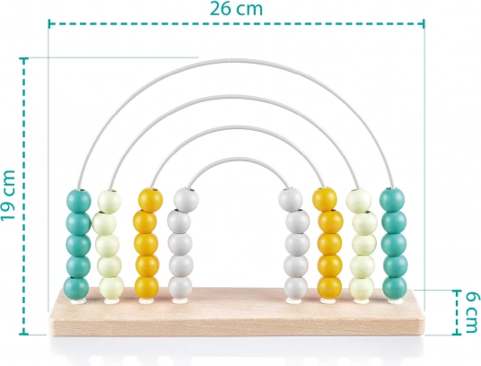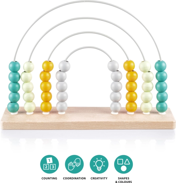 Dette stilfulde træabacus med regnbuedesign er et ideelt hjælpemiddel til førskolebørn. Takket være de farverige perler på de solide metalbuer øver børn på legende vis tælling, sortering og farvegenkendelse. Naturligt bøgetræ og vandbaserede farver sikrer en sikker og holdbar udførelse.