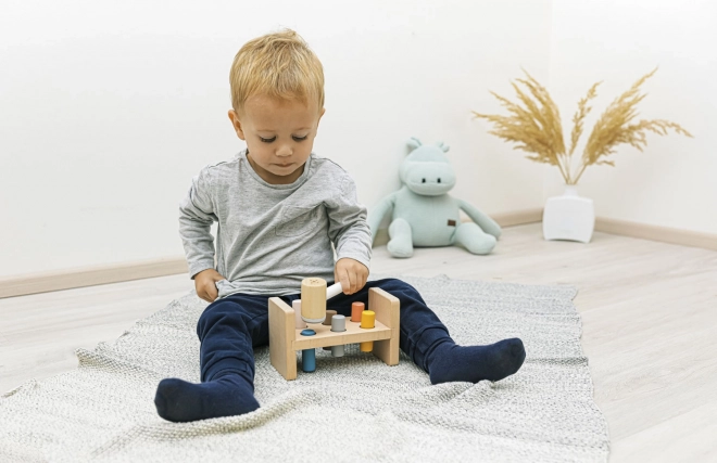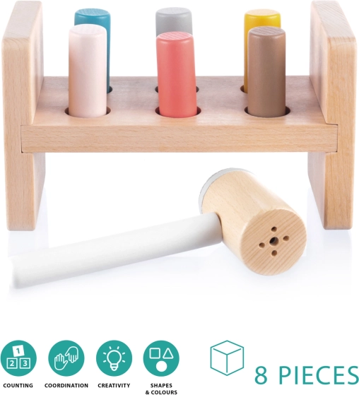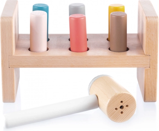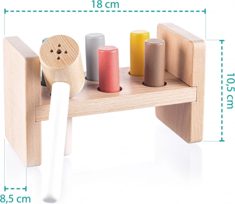 Under bordet er der en praktisk åbning til opbevaring af hammeren, når barnet ikke bruger legetøjet. Dette legetøj hjælper med at udvikle motoriske færdigheder, lærer børn at genkende farver og forbedrer koordination. Det er lavet af naturligt bøgetræ og sikre vandbaserede farver, der sikrer kvalitet og sikkerhed.